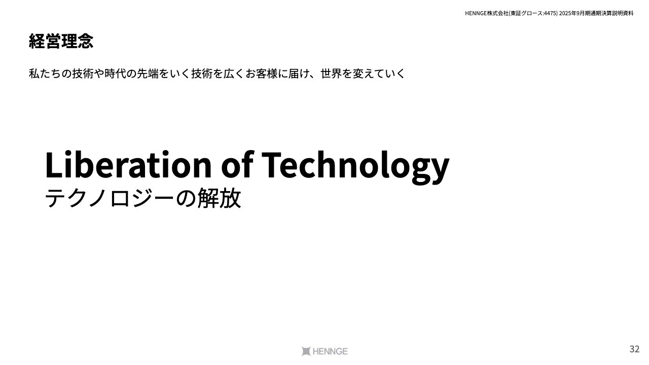 当社の成長戦略についてご説明します。HENNGEの経営理念は「テクノロジーの解放」です。私たちは、テクノロジーが大好きで、それが世の中を良くしていくと強く信じています。この力をできるだけたくさんのお客さまに届けることによって、世の中を少しでも良い方向に動かしたいというのが私たちの思いです。
