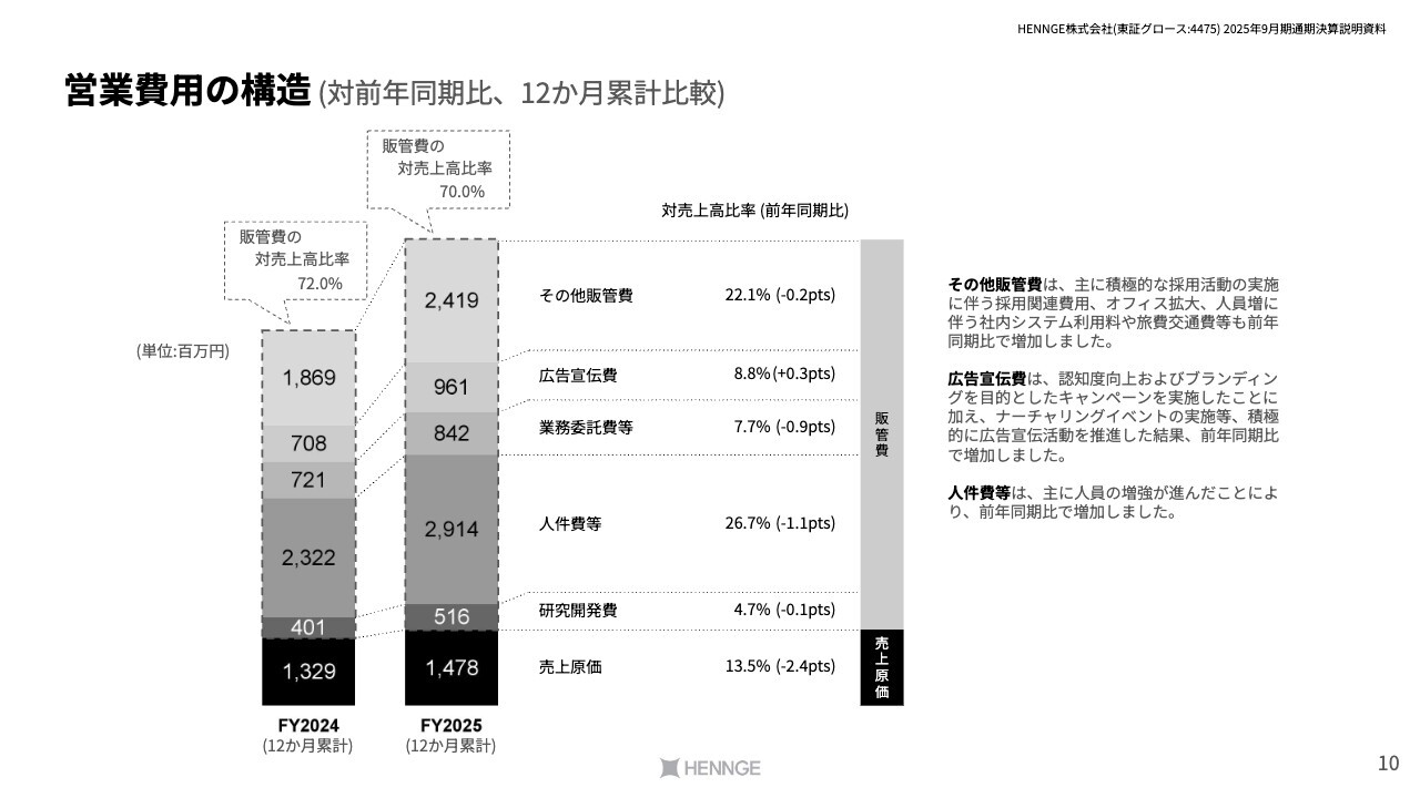 営業費用の内訳の対前年同期比は、スライドのとおりです。採用力強化のための費用に加え、人員拡充に伴う人件費や、広告宣伝の中でもブランディングにかかる費用などが増加しています。
