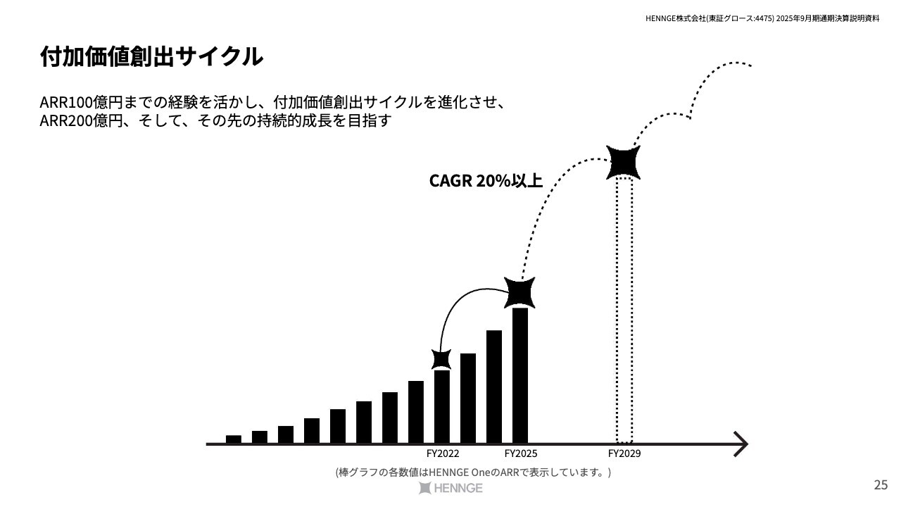 2025年9月期は、付加価値創出サイクルが一巡した年でした。そのため、2026年9月期は、次なる付加価値創出サイクルの始まりであり、ARR200億円に向けた準備期間と位置づけています。