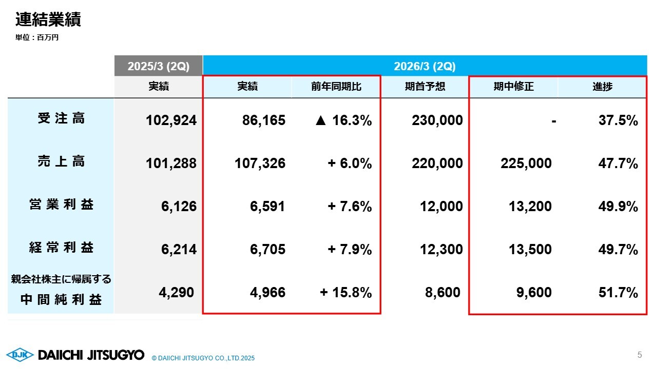 府川治氏(以下、府川):取締役常務執行役員CFOの府川です。当期の決算概要についてご説明します。連結業績は増収増益となり、売上高および各段階利益は第2四半期累計として過去最高となりました。受注高の進捗率は期首予想に対して50パーセント以下となっていますが、一部の受注予定案件が下期にずれていることもあり、今後挽回できるものと考えています。