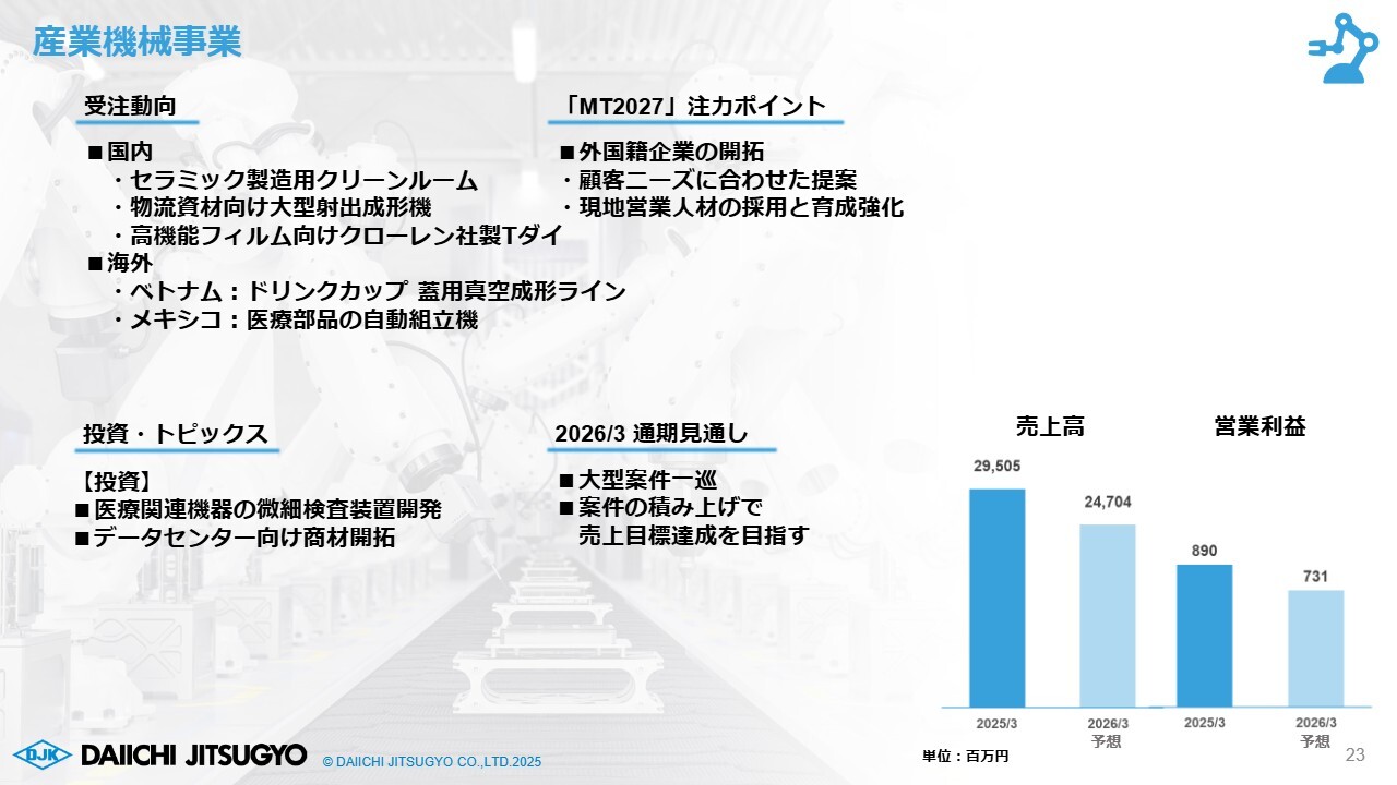 一例として、昨年は受注高が約2,000億円でしたが、今回は約2,300億円を目指しており、10パーセントほど増加しています。電池の状況がやや落ち着いた中でも、各事業ポートフォリオ内の重点領域をしっかりとサポートすることで、中期経営計画「MT2027」の目標を達成していきたいと考えています。