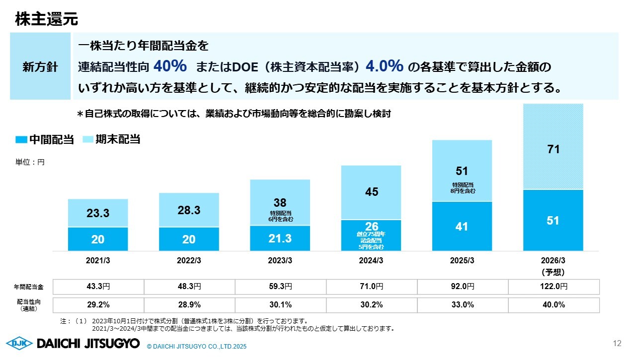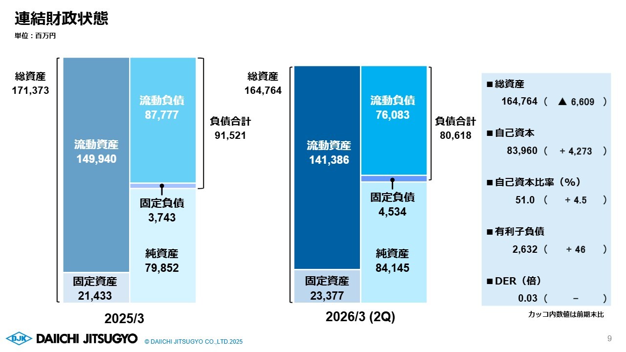 また、2026年1月から取適法が適用されれば、立替資金が数十億円発生する可能性もあるため、過剰という認識はありません。ただし、やはり重要なのはその使い方です。今後の事業投資、人材投資、株主還元へも適切に振り分けていきたいと考えています。