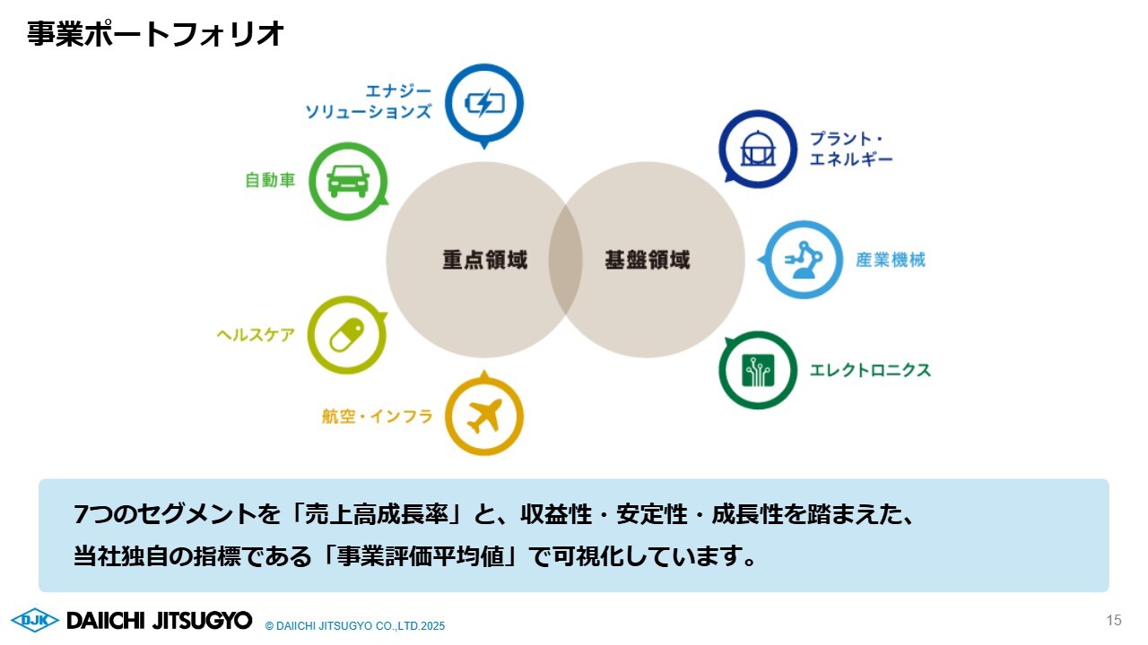 次に、事業ポートフォリオについて簡単にイメージを捉えていただければと思います。当社は7つのセグメントを「売上高成長率」と、収益性・安定性・成長性を踏まえた独自の指標である「事業評価平均値」で可視化しています。