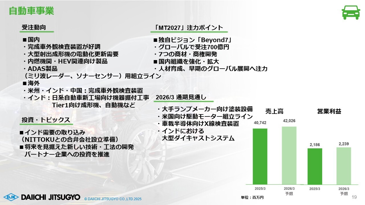 重点領域2つ目の自動車事業についてです。国内市場の受注動向は、完成車外観検査装置が好調です。これは米国、インド、中国でも非常に好調です。さらに、カーボンニュートラルに向けた自動車各社の取り組みにより、大型射出成形機の電動化更新の需要を取り込んでいきます。