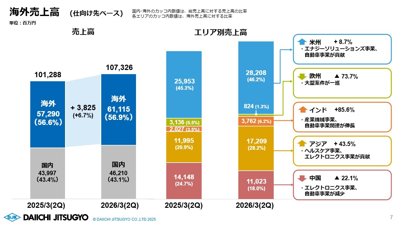 アジアエリアでは、ヘルスケア事業とエレクトロニクス事業が貢献し、前年同期比43.5パーセント増加の172億円となりました。中国エリアでは、エレクトロニクス事業と自動車事業の売上が減少し、前年同期比22.1パーセント減少の110億円となっています。今年度から独立したインドエリアは、産業機械事業と自動車事業が伸長し、38億円となりました。