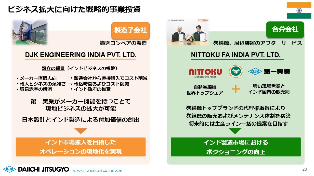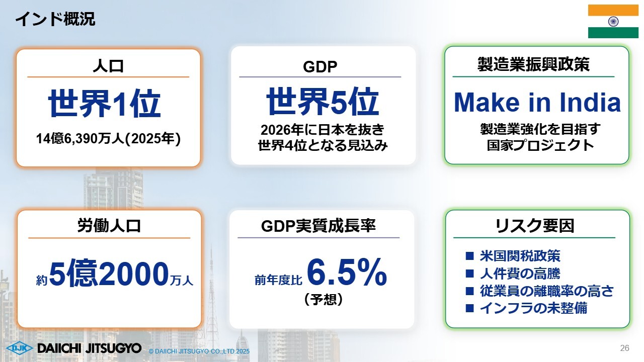モディ首相が掲げる製造業振興政策「Make in India」を好機と捉え、インドの現地社員と一体となり、インドのお客さまとの取引拡大を目指していきます。米国による高い関税や人件費の高騰、離職率の高さなどのリスク要因はありますが、これらに注意を払いながら、慎重かつダイナミックに事業を進めていく方針です。