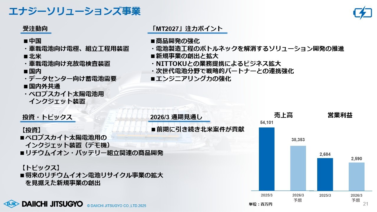 国内市場向けでも、新たな半固体・全固体向けの投資やラボラインなどを含めて引き合いをいただいており、それらの受注獲得を進めていきます。さらに、データセンター向けリチウムイオン蓄電池の需要増加を取り込むという新たな市場開発を通じ、受注を積み上げていく考えです。