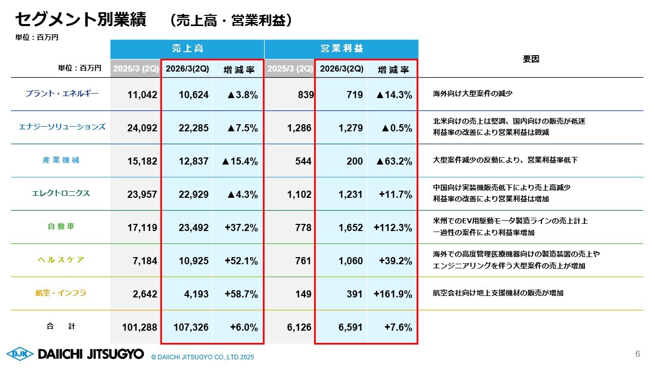 はじめに、決算ハイライトについてです。当期は前年同期に比べて増収増益となり、売上高および各段階利益が第2四半期累計として過去最高の業績となりました。事業別では、当社が重点領域とする自動車事業、ヘルスケア事業、航空・インフラ事業が業績を牽引しました。