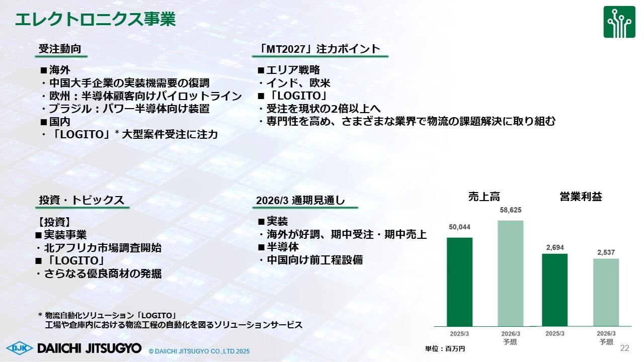 一方国内では、当事業の第2の柱である「LOGITO」関連の需要が活発であり、引き合いから受注までを集中的に取り組んでいきます。「LOGITO」はモノ作りの現場における物流の無人化・省人化などを提案するもので、当社独自のブランド名です。