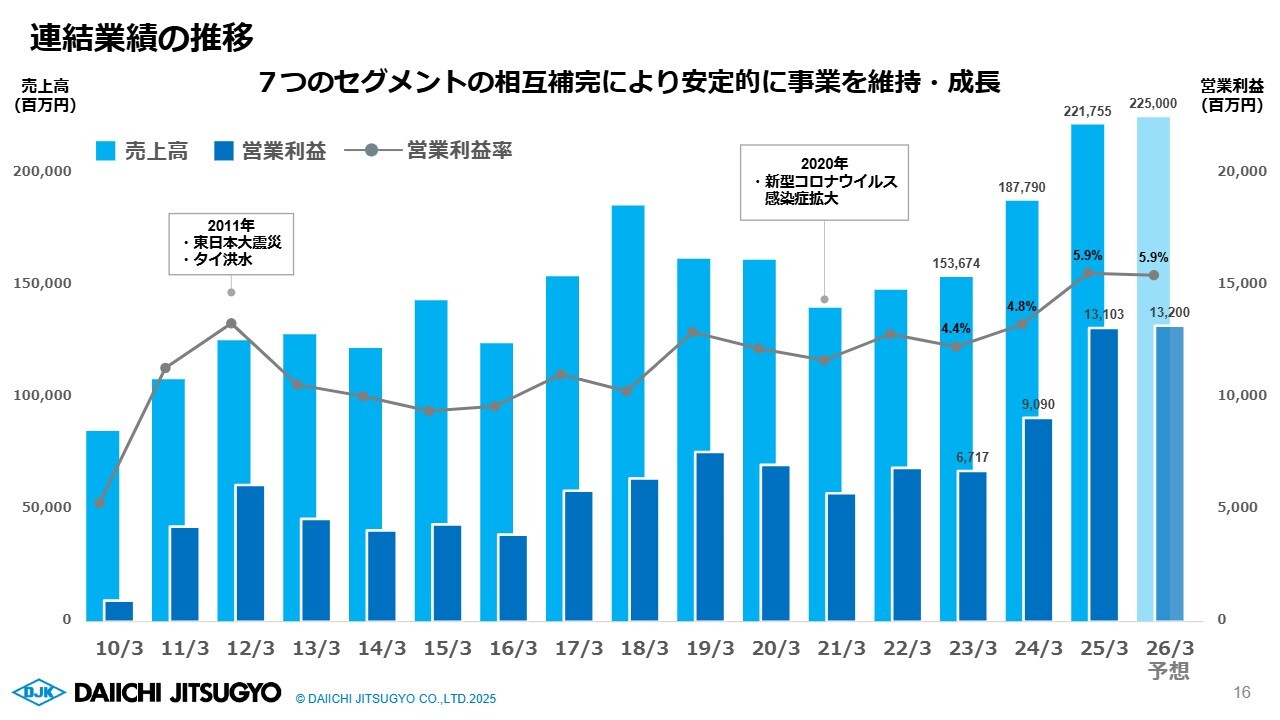 スライドのグラフは、2010年3月期から現在までの売上高・営業利益・営業利益率を示しています。自然災害やパンデミック、好不況の影響を受けつつも、業績への深刻なダメージを受けることなく、安定した成長を続けています。