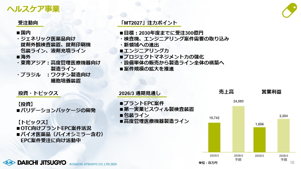 まずは重点領域であるヘルスケア事業についてです。受注動向については、日本市場においてジェネリック医薬品やOTC(一般用医薬品)の需要増加、業界の再編などにより設備投資が活発になっています。そのような状況の中で、当社は外観検査装置、印刷検査装置、液剤充填ラインなどの受注を、当社のエンジニアリングを発揮してしっかりと進めていきます。
