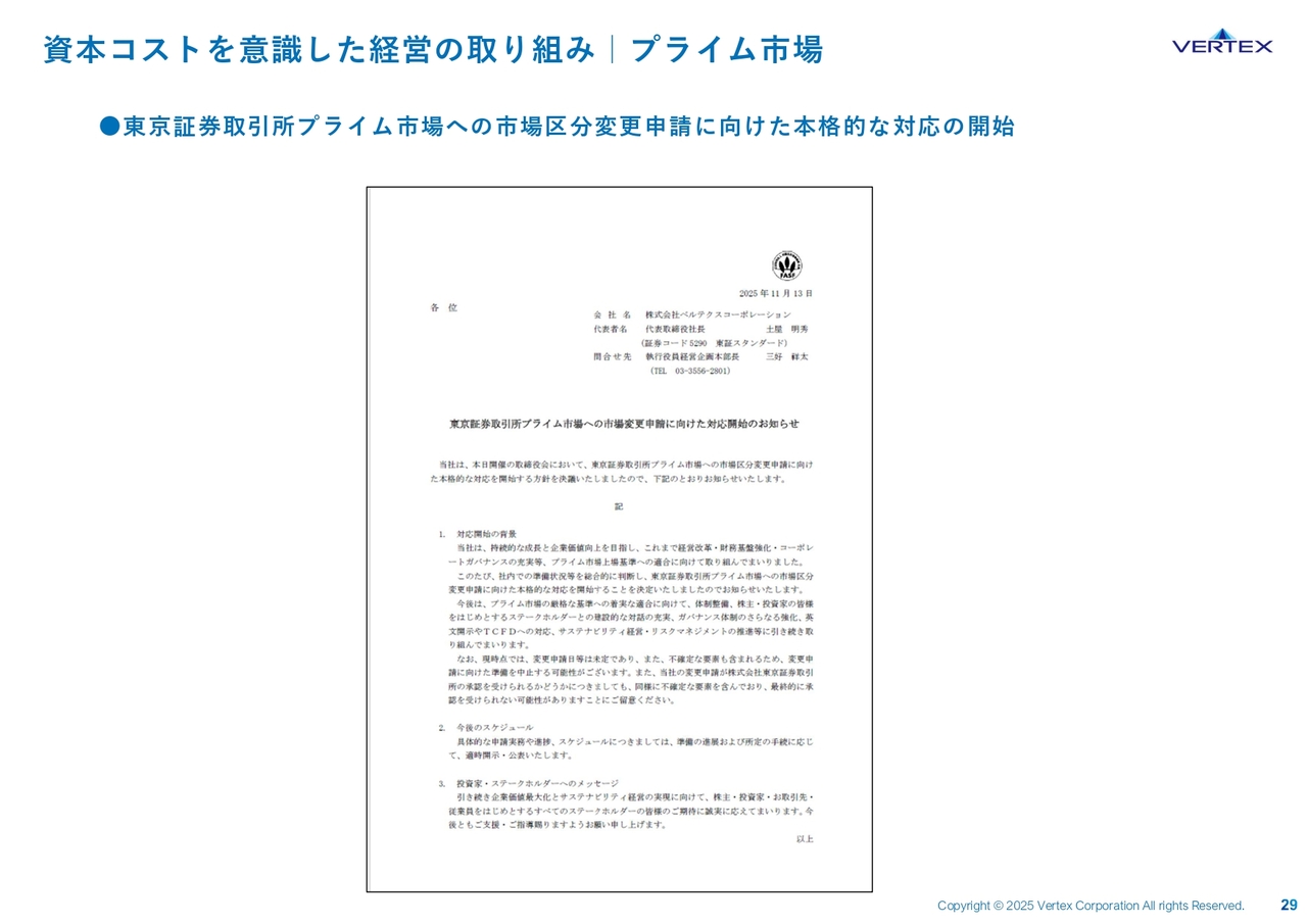 それでは、次に資本コストを意識した経営の取り組みについてご説明します。11月13日に「東京証券取引所のプライム市場への市場区分変更申請に向けた本格的な対応の開始」について開示しました。