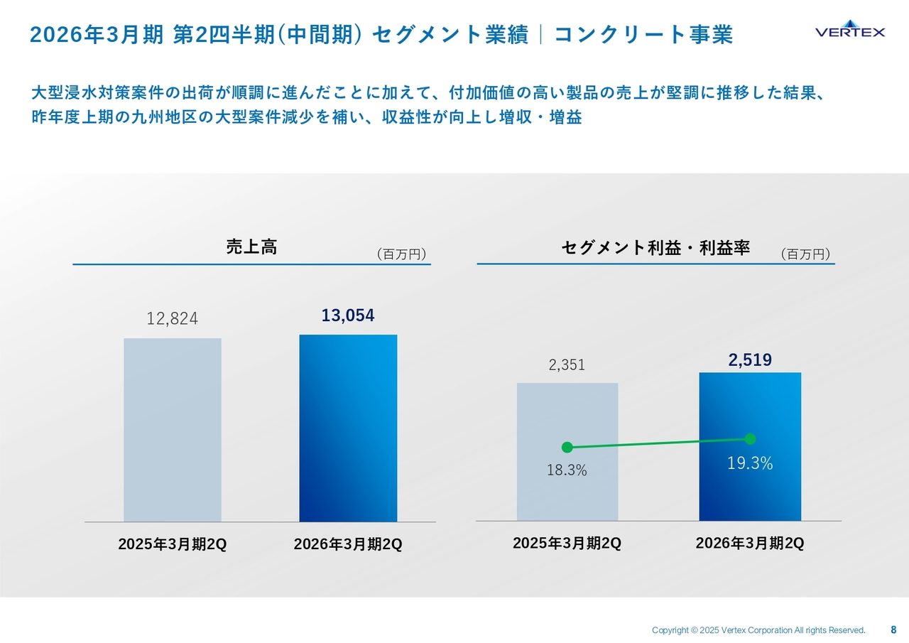 続いて、セグメント別の業績についてご説明します。スライドのグラフは、コンクリート事業における2025年3月期第2四半期(中間期)と2026年3月期第2四半期(中間期)の売上高、利益、利益率を示しています。先にお伝えしたとおり、2026年3月期第2四半期(中間期)のコンクリート事業の売上高は前年比1.8パーセント増の130億5,400万円、利益額は前年比7.1パーセント増の25億1,900万円でした。