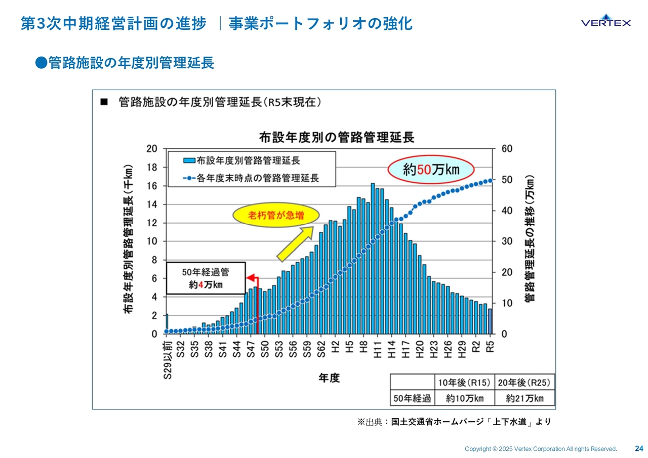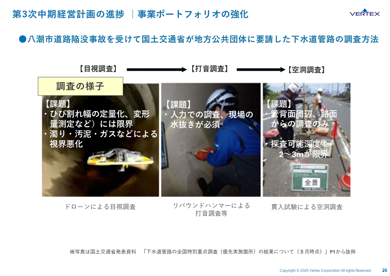 特に、今年2月の埼玉県八潮市で発生した道路の陥没事故をきっかけに、下水道管路の老朽化対策が喫緊の課題として一気に注目を集めました。これらの国の方針は、当社にとって大きな追い風であると捉えています。
