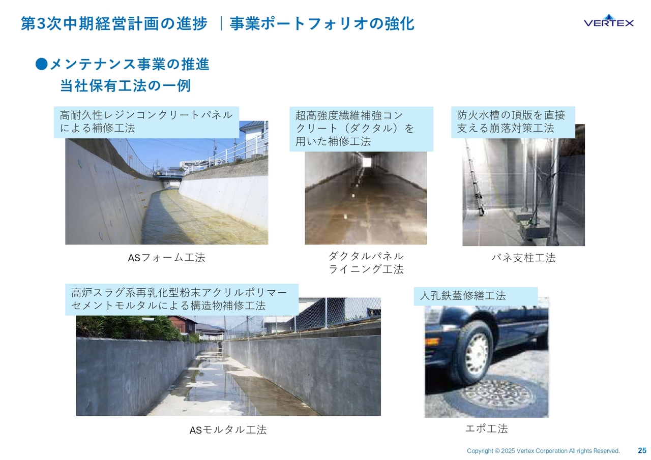 加えて、埼玉県八潮市の陥没事故を契機に注目されるようになりましたが、我が国におけるインフラの老朽化は深刻な状況です。当社は、製造だけでなく、老朽化したインフラの診断、提案、メンテナンスを行い、インフラを健全で長く使用できるようにするための材料や技術の提供にも取り組んでいきます。
