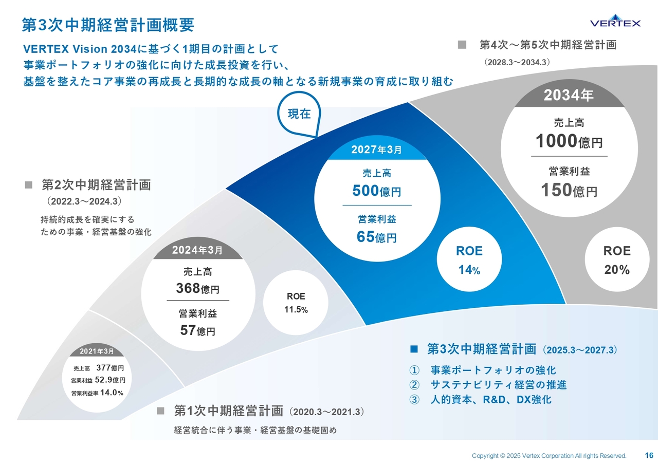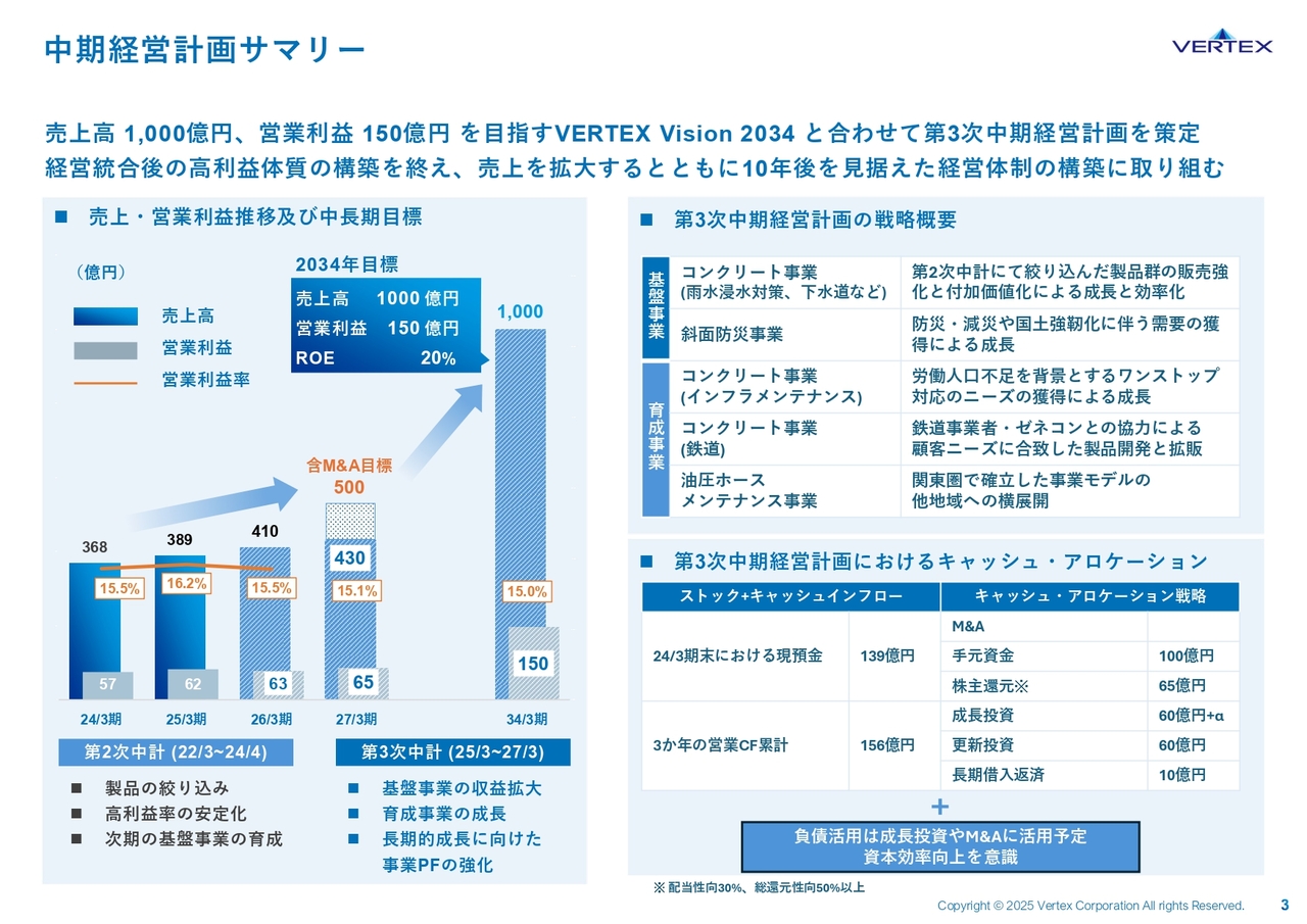 こちらが、売上高1,000億円および営業利益150億円を目指す「VERTEX Vision 2034」に関する内容と、第3次中期経営計画のサマリーです。