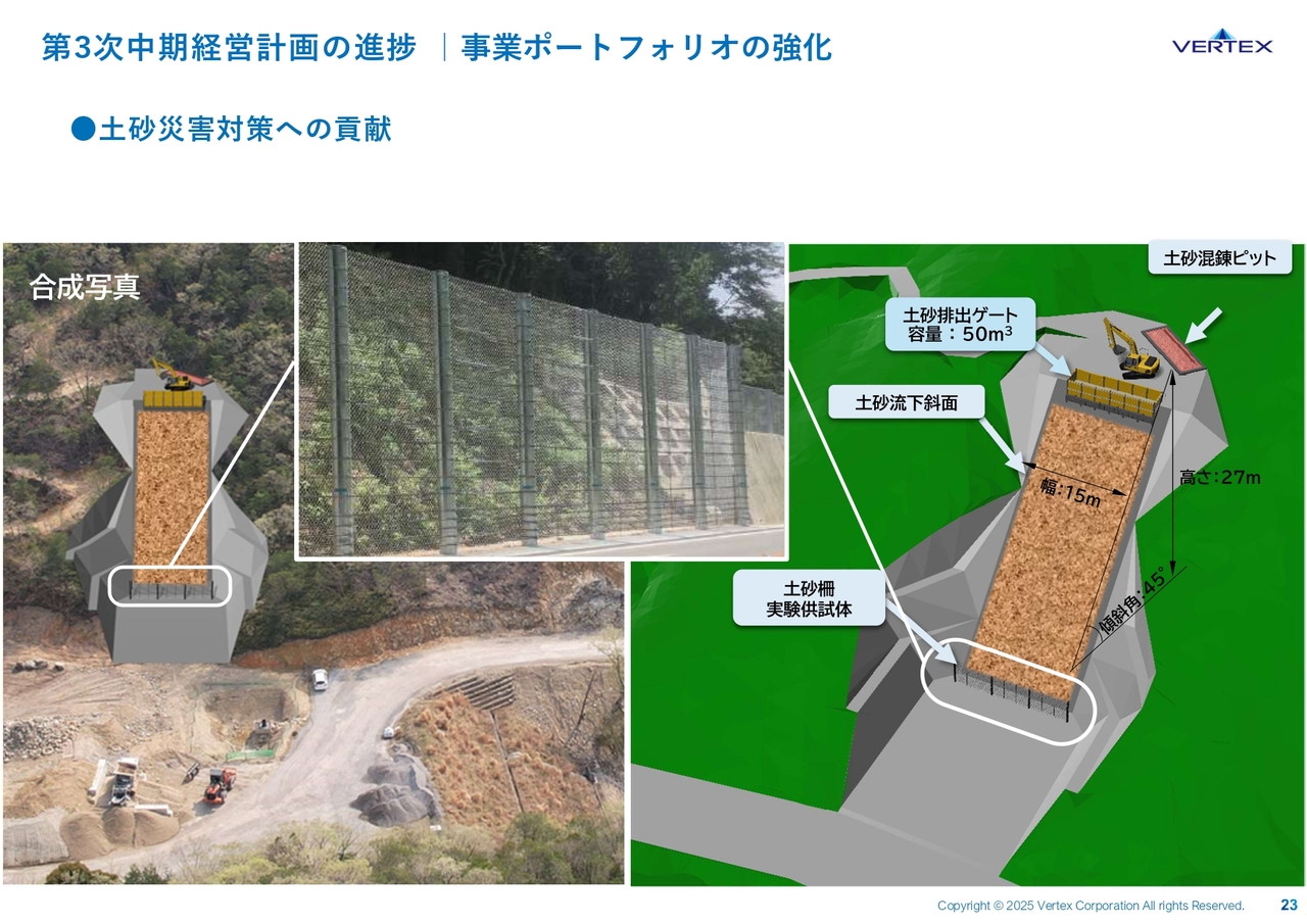 ここまで浸水対策についてお話ししましたが、豪雨被害などに起因する災害として土砂災害があります。「第1次国土強靱化実施中期計画」でも触れられている山地災害危険地区における治山対策の一環として、さらなる製品ラインナップの拡充を目的に、土砂災害用の土砂柵に関する製品実験場を兵庫県西脇市に新設します。