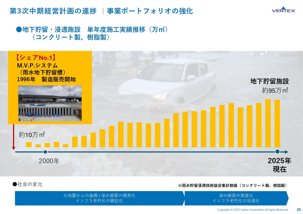 スライドのグラフをご覧ください。樹脂製を含む地下貯留施設の全国実績です。統計開始の1997年では10万立米程度でしたが、直近では95万立米と、27年間で約10倍に増加しています。先ほどご説明しましたが、「M.V.P.システム」を開発したのはこの1996年にあたります。