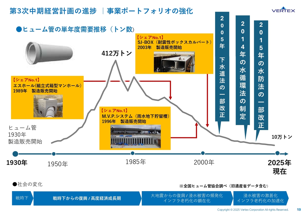 その後、全国的な下水道の普及率の上昇に伴い需要が減少し、現在では10万トンとなっています。このようにヒューム管市場は縮小し、ピーク時の約40分の1となっています。