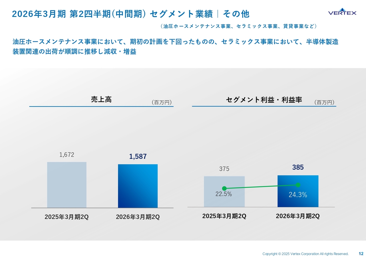 その他の売上高は15億8,700万円で、前年比マイナス5.1パーセント、利益額は3億8,500万円で前年比プラス2.5パーセントでした。油圧ホースメンテナンス事業は期初の想定を下回ったものの、セラミックス事業では半導体製造装置関連の出荷が順調に推移し、減収ながら増益となりました。