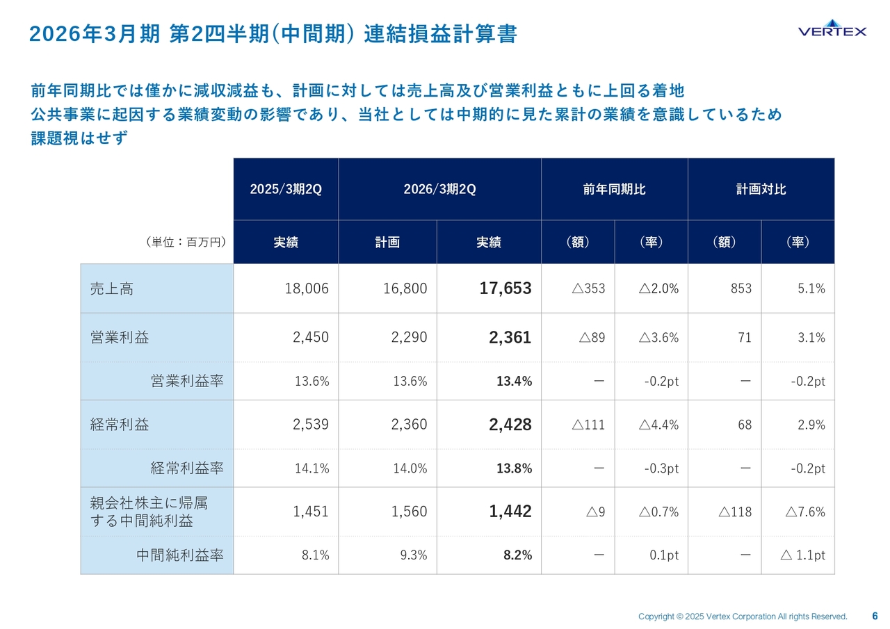 営業利益は23億6,100万円で、前期比マイナス3.6パーセント、計画比プラス3.1パーセントとなりました。業績の概要としては、2026年3月期上期では前期の大型案件減少を補いました。前年同期比ではわずかに減収減益となりましたが、計画に対しては売上高および営業利益ともに上回る結果となりました。
