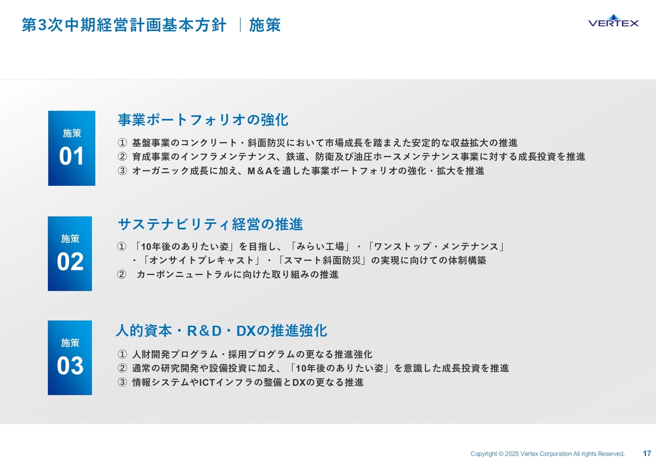 この第3次中期経営計画の達成に向け、3つの基本方針を策定しています。施策1は「事業ポートフォリオの強化」、施策2は「サステナビリティ経営の推進」、施策3は「人的資本・R&D・DXの推進強化」です。