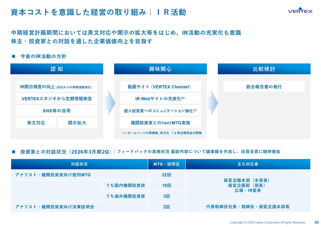 また、10月1日には統合報告書を発行しました。今後、IR部門をさらに強化し、情報開示の高度化や株主との対話プロセスの見直しを進めていく予定です。