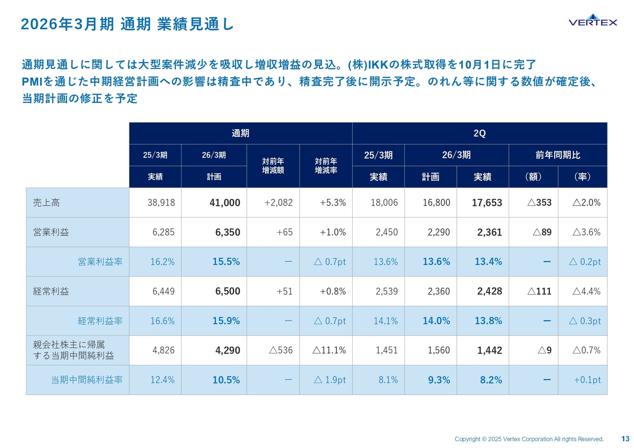 公共事業の発注の波による影響がありましたが、当社としては中期的な累計業績を重視しており、特段の課題とは認識していません。なお、株式会社IHI建材工業の株式取得を10月1日に完了し、商号を株式会社IKKに変更しました。PMIを通じた中期経営計画への影響については現在精査中であり、精査完了後に開示予定です。