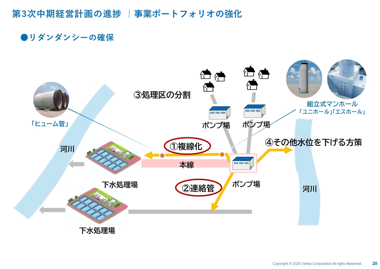 これに伴い、本管であるヒューム管や、それに付随し当社が圧倒的シェアを誇る「エスホール」や「ユニホール」の需要増が見込まれます。このような最新の動向を的確に捉え、拡販につなげていくことが重要です。