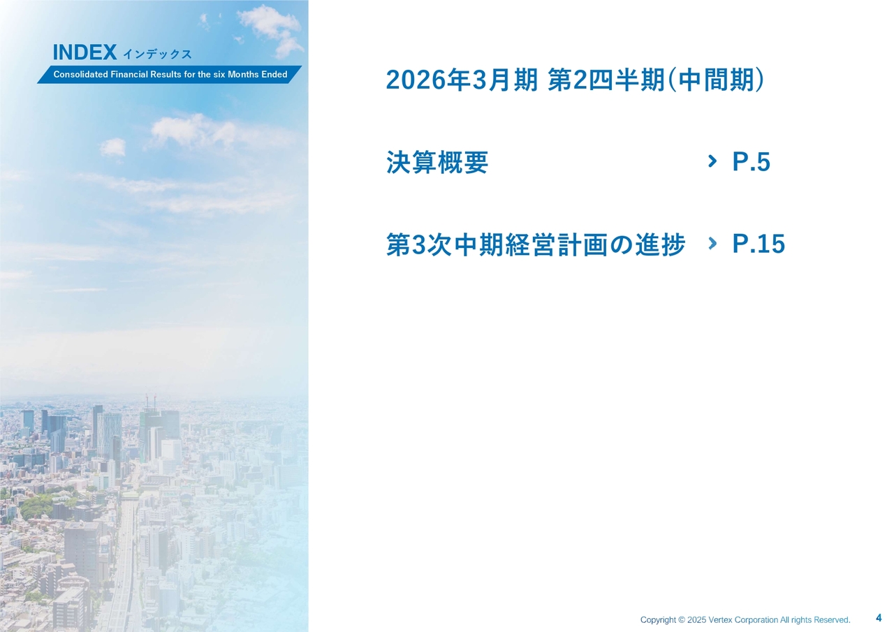 本日の説明内容のインデックスです。最初に2026年3月期第2四半期(中間期)決算概要、続いて第3次中期経営計画の進捗について順にご説明します。