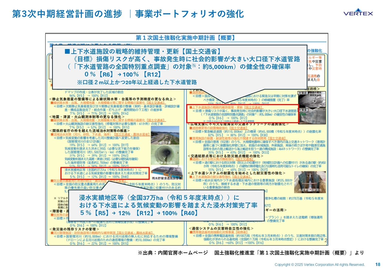 まず、市場環境の背景についてご説明します。スライドをご覧ください。小さくて恐縮ですが、こちらは内閣官房が今年6月に公表した「第1次国土強靱化実施中期計画」の推進が特に必要な施策として整備された内容です。