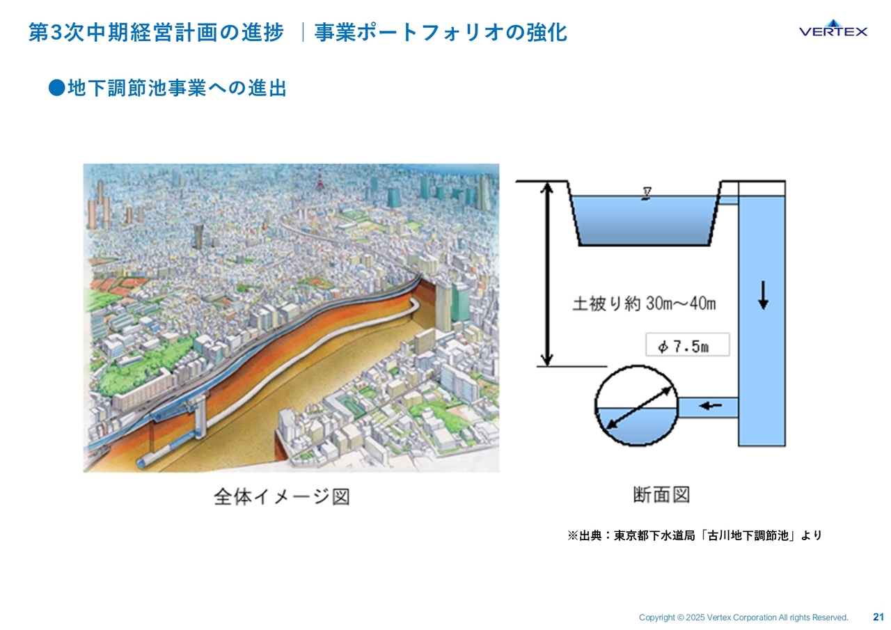 この事業は競合が少ない領域であり、同社の製品は他社と比較してコスト面で優位性があると試算しています。この合成セグメントを軸に、当社が保有する営業ネットワークを活用してシナジーを発揮し、大きな需要が見込まれる地下トンネル調整池の事業へ展開を図っていきます。