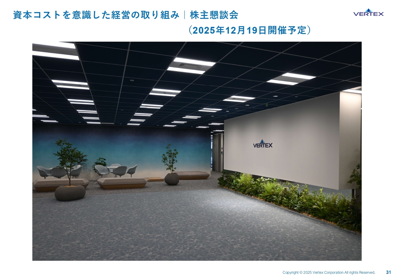 さらに、先月の本社移転に伴い、12月19日に新本社に株主さまをお招きし、株主懇談会を開催する予定です。