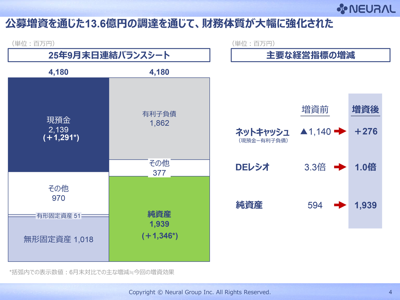 増資の結果、バランスシートを強化することができました。スライド左側の図は2025年9月末時点の連結バランスシートですが、これは2025年6月末に開示したバランスシートに今回の調達額を加えたものです。ご覧のとおり、バランスシート全体の規模は41億8,000万円に拡大しました。