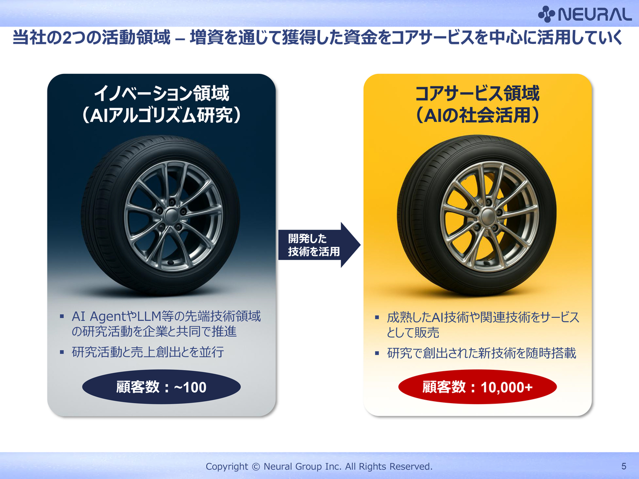 2つ目の柱はコアサービス領域で、こちらが当社の売上収益の基盤となっています。AIの研究をイノベーション領域で行い、それを社会へと実装し、お客さまに価値を提供するサービスへと転換するのがコアサービス領域です。今回の調達資金を活用し、これをさらに拡大していくことを目指しています。