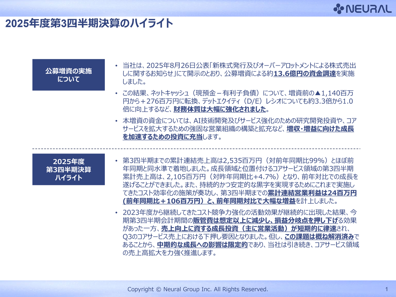 ニューラルグループ、EBITDAと営業利益を第3四半期で黒字化 コアサービス拡大とM&A推進を成長ドライバーに