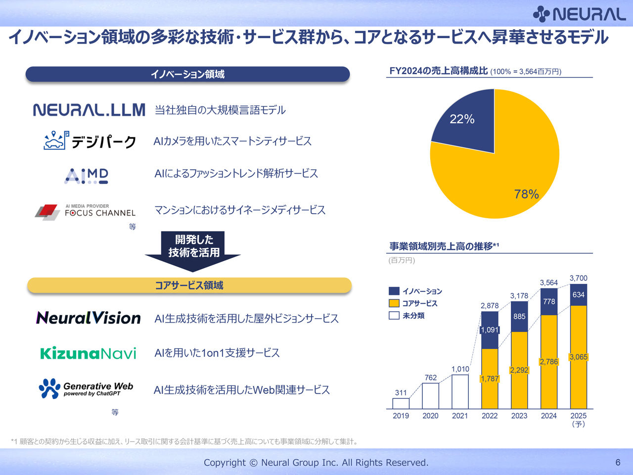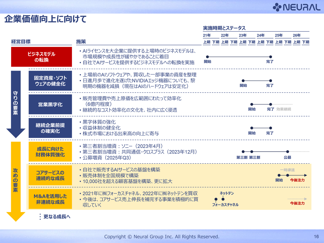 時系列になっていますが、一番上には上場以降の「ビジネスモデルの転換」とあります。AIライセンスを大企業に提供してフィーをいただくモデルから、自社でコアサービスを開発するモデルへと転換を行ったのが2021年でした。2024年下期にビジネスモデルの転換が完了するまでの約4年間で、事業内容は大幅に変化したと考えています。