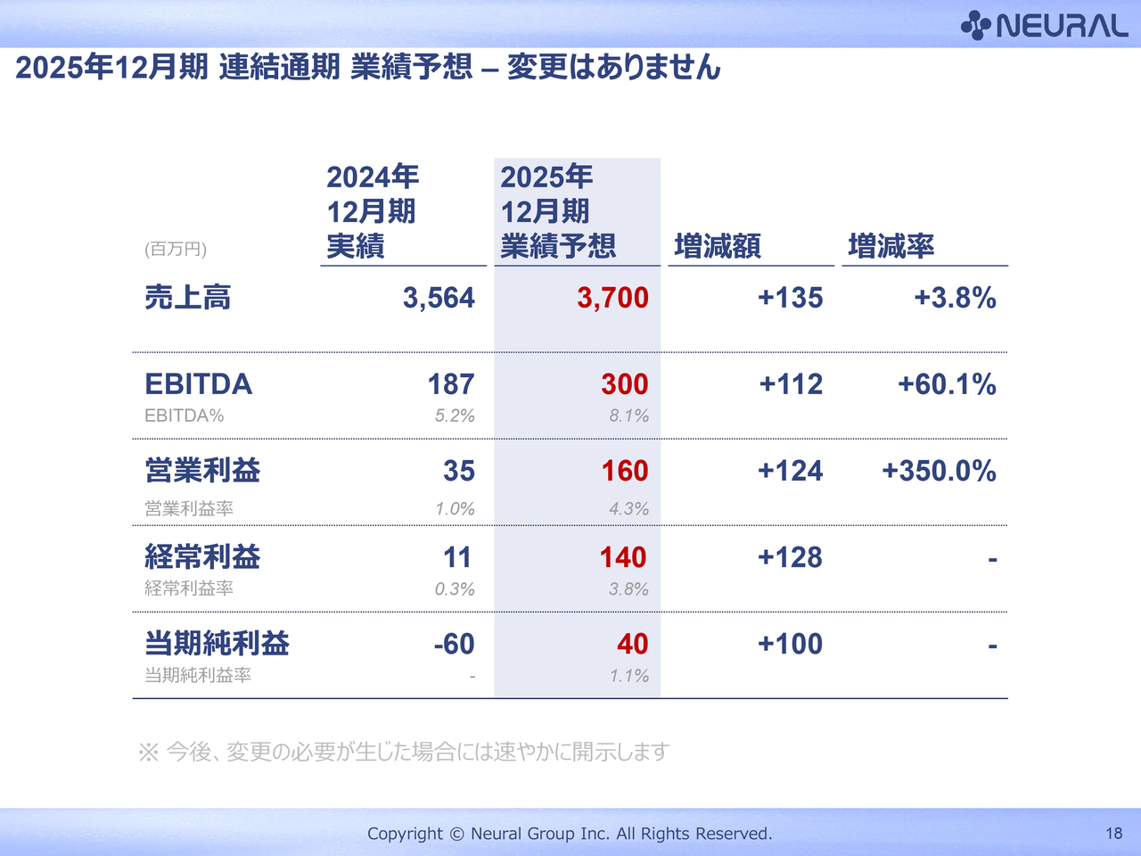 今期の業績予想です。第3四半期は力強く進むことができませんでしたが、現時点では2025年12月期の通期業績予想に変更はありません。