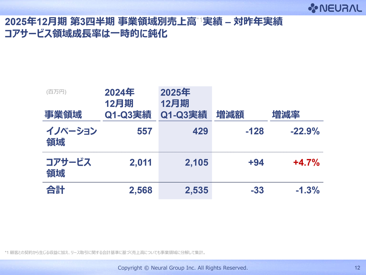 売上高があまり伸びなかった要因についてです。イノベーション領域はこれまでどおり、規模をある程度制限しながら、適切な量の研究開発を行っていく方針でした。ただし、コアサービス領域において、我々が見込んでいた大幅な成長を第3四半期では実現できなかったことが影響しています。
