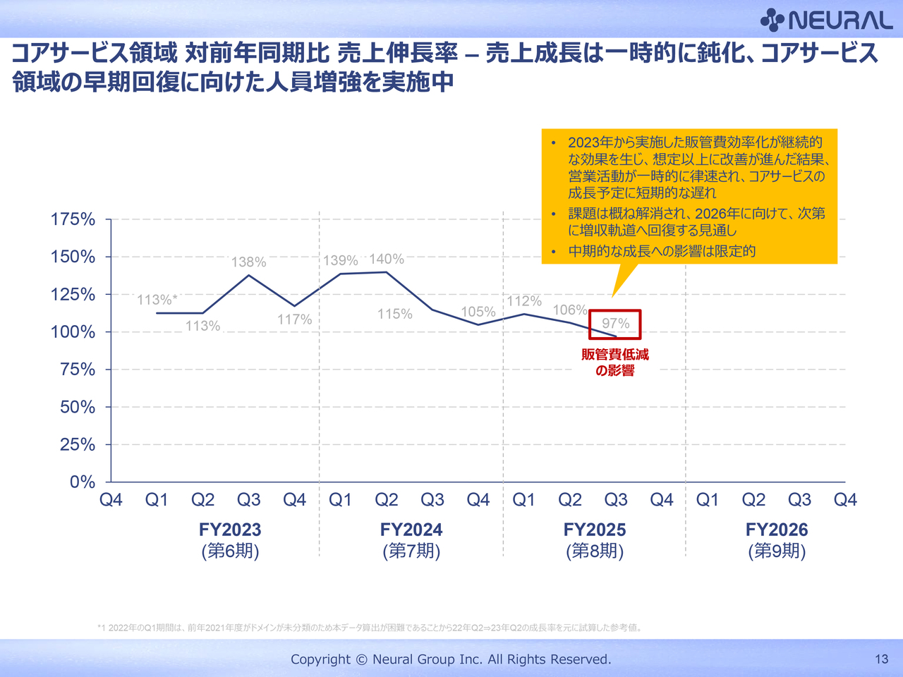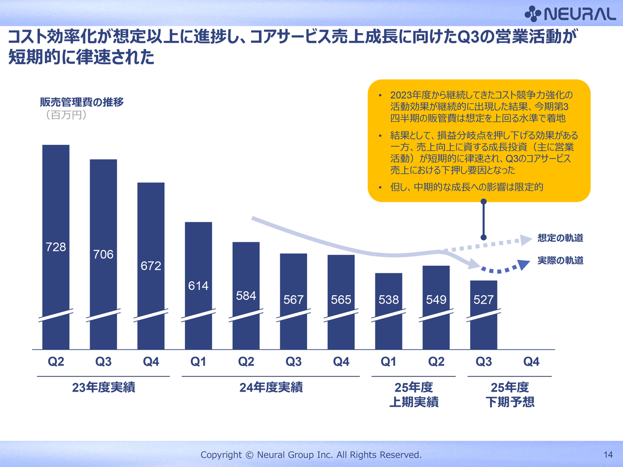 コスト効率化が想定以上に進捗し、コアサービス売上成長に向けたQ3の営業活動が短期的に律速された