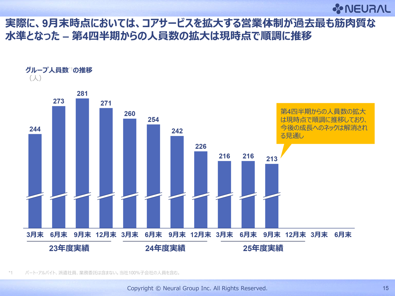 現在の人員数は連結ベースで213名であり、この数字にはパート・アルバイト、派遣社員、業務委託は含まれていません。6月末以降に約10名の増加を見込んでいましたが、思ったほど伸びませんでした。しかし、10月時点では増加傾向に転じており、今後は順調に増加していくと見ています。