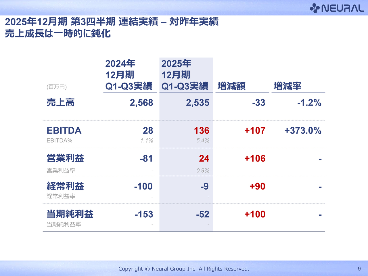 これが完了したタイミングで営業黒字化を目指し、コスト効率化を社内で広く浸透させることで、利益を伴いながらコアサービスを販売することを実現しました。この取り組みについては2024年に完了したと考えていましたが、その効果が継続した結果、この第3四半期は増収を大きく進めることはできませんでした。ただし、これは一時的な想定外の要因ですので、中期的には特に問題はないと考えています。