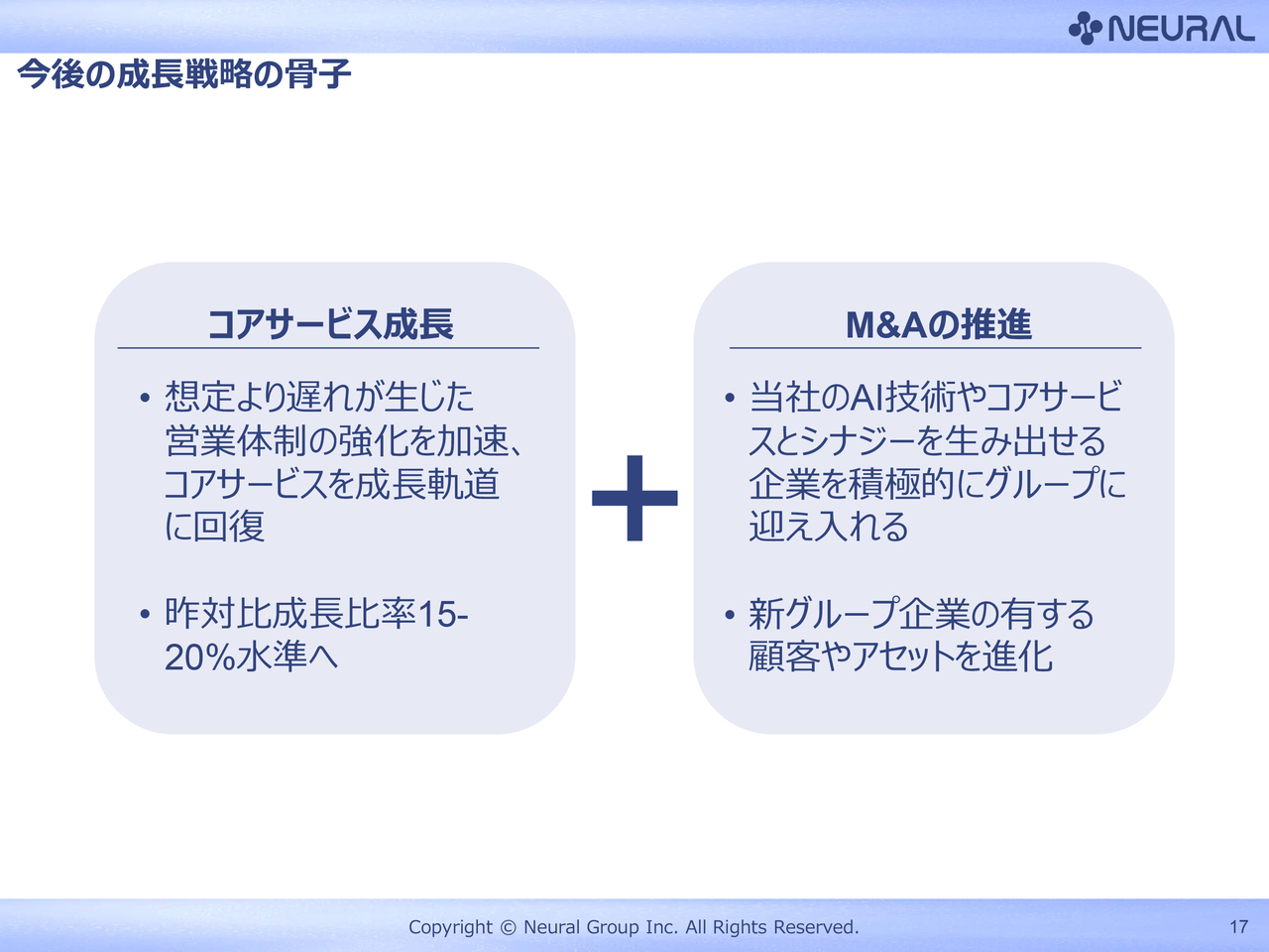 M&Aにより、新規事業の成長とコアサービスの成長がシナジーを発揮し、さらなる成長が可能になると考えています。今後もコアサービスの成長とM&Aの積極的な活用を主要な成長ドライバーとして進めていきます。
