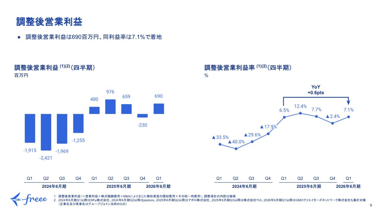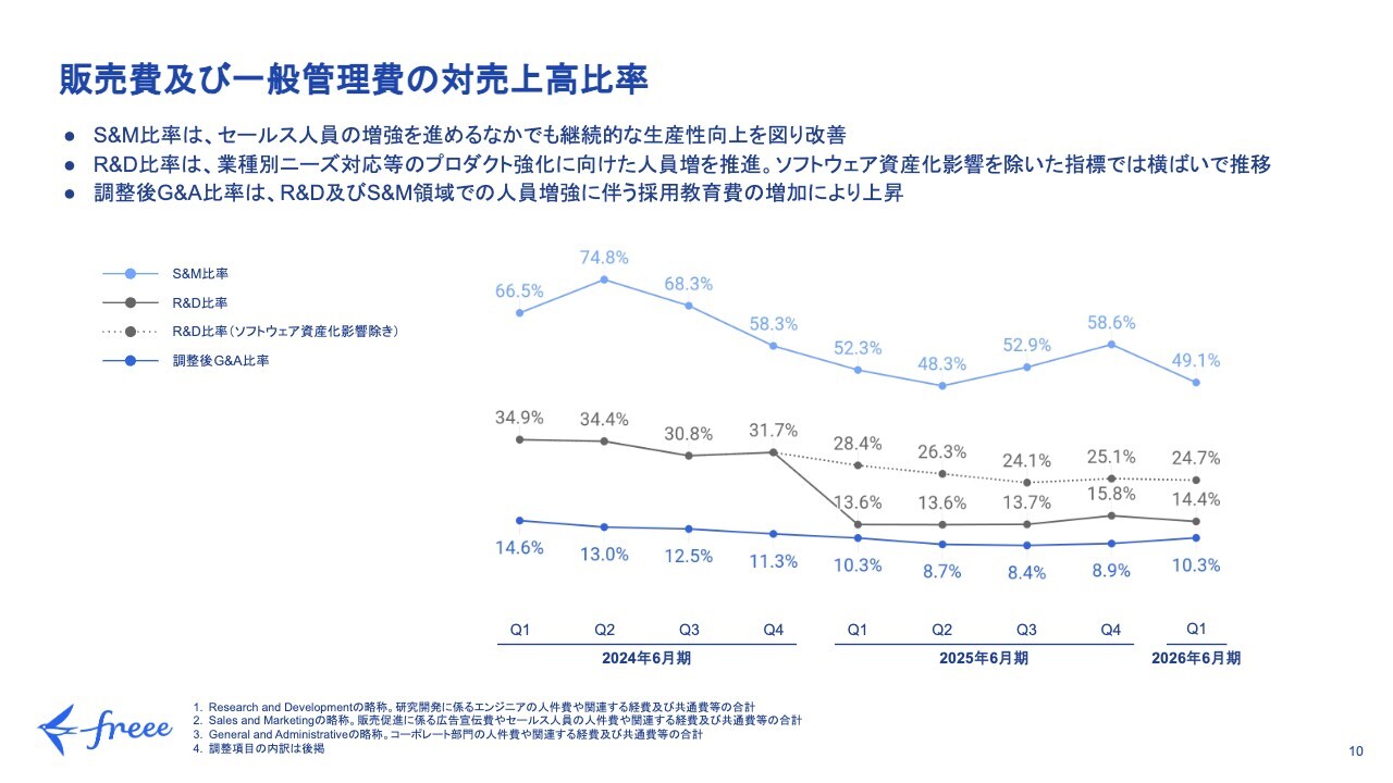 最後に、青いラインで示されている調整後G&A比率についてです。2026年6月期第1四半期は10.3パーセントとなっています。特に営業や開発チームでの人員採用が第1四半期で順調に進んだため、採用教育費が増加し、G&Aに反映されました。