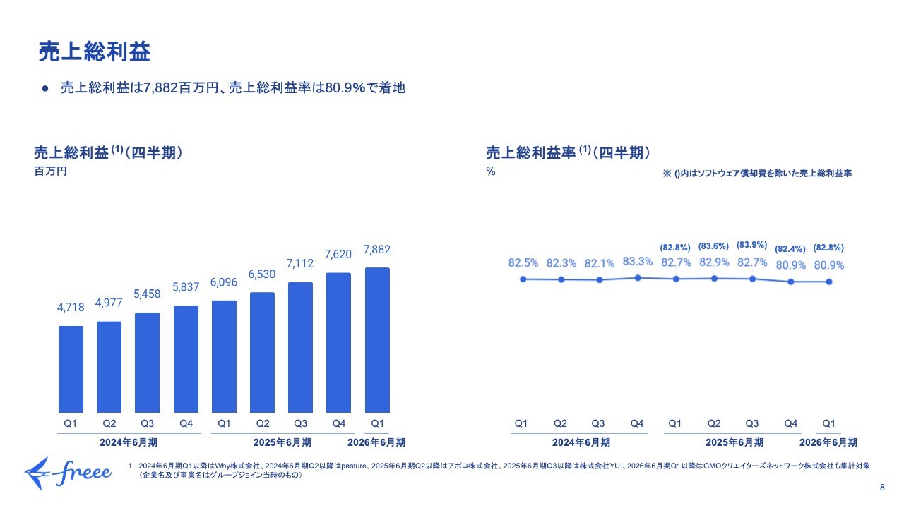 2026年6月期第1四半期の売上総利益は78億8,200万円で、売上総利益率は80.9パーセントとなりました。