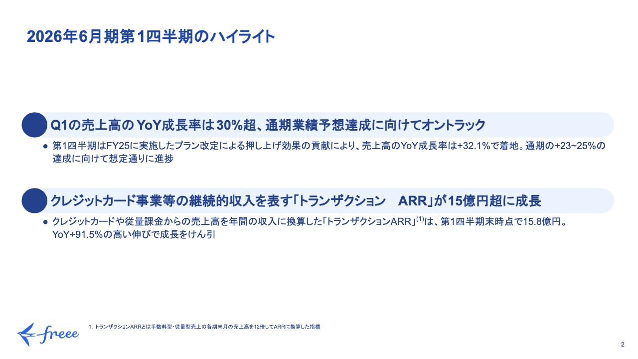 まず、2026年6月期第1四半期のハイライトは2点あります。1点目に、売上高成長率は30パーセント超を継続しており、通期業績予想達成に向けて計画どおりに進捗しています。