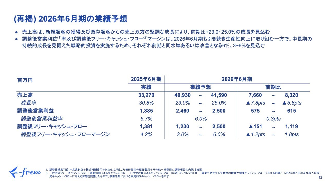 スライドに記載のとおり、売上高成長率は23.0パーセントから25.0パーセント成長、調整後営業利益率は6.0パーセント、調整後フリー・キャッシュ・フローマージンは3.0パーセントから6.0パーセントという業績予想を維持しています。