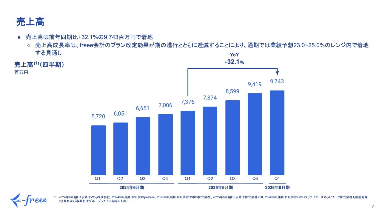 昨年度実施したプラン改定の効果が持続していることから、第1四半期の売上高成長率は32.1パーセントとなりました。通期目標の売上高成長率である23パーセントから25パーセントに向け、想定どおり進捗しています。