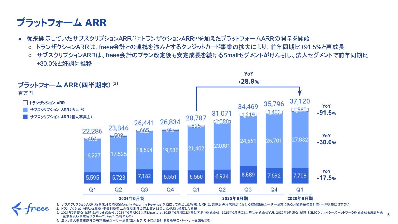 このプラットフォームARRは、前年同期比28.9パーセント増の371億2,000万円となりました。内訳として、「トランザクションARR」は91.5パーセントの成長率を記録しています。また、「サブスクリプションARR」は、法人セグメントが30.0パーセント、個人事業主セグメントが17.5パーセント成長しています。