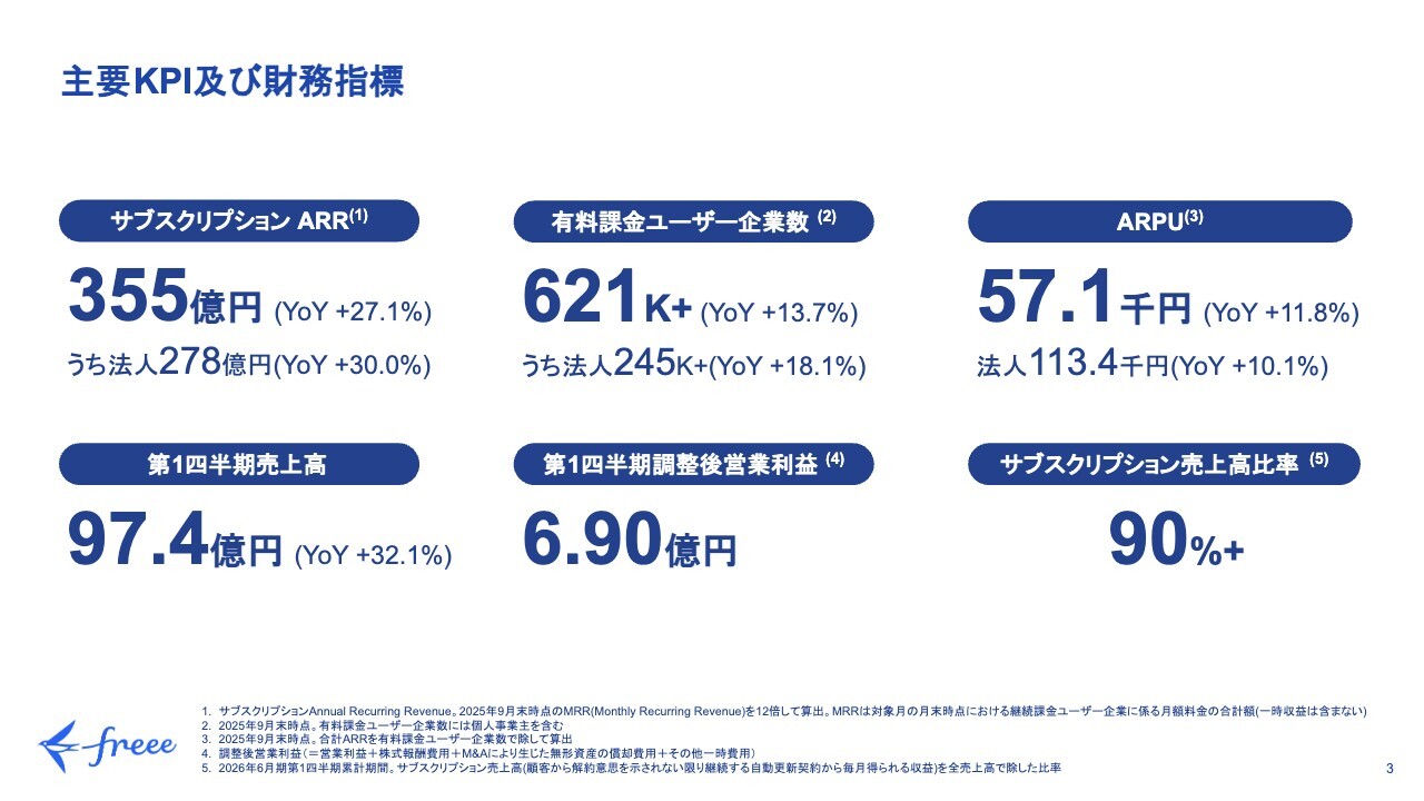 主要KPI及び財務指標です。スライド上段のみ簡単にご説明すると、サブスクリプションARRは355億円で、そのうち法人のARRは278億円、ちょうど前年同期比30.0パーセントの成長を記録しました。